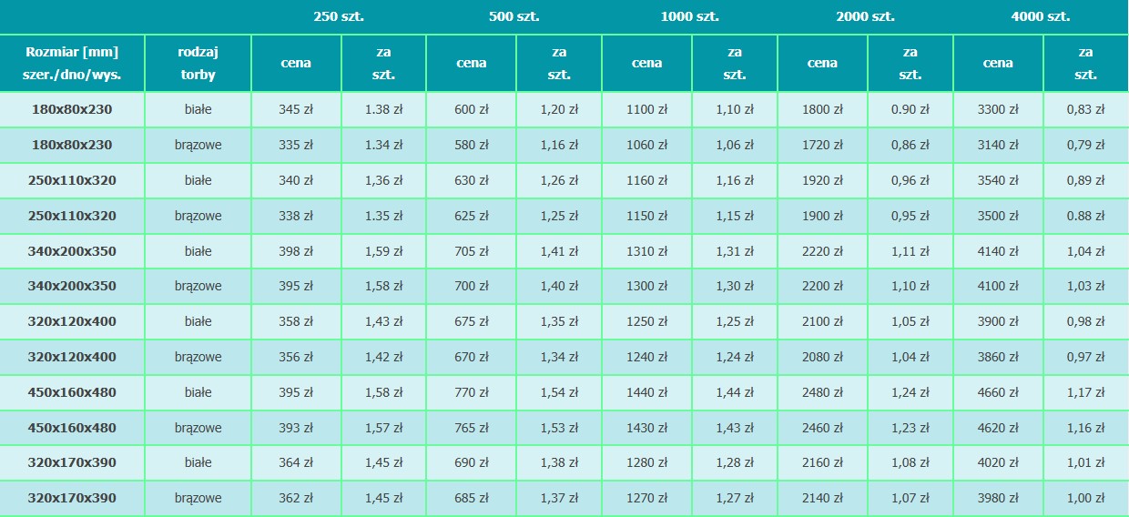 Cennik do nakładu 4000 sztuk jak w tabelce wyżej. Cennik powyżej 4000 sztuk proszę pisać na maila: info@torbyzpapieru.pl.