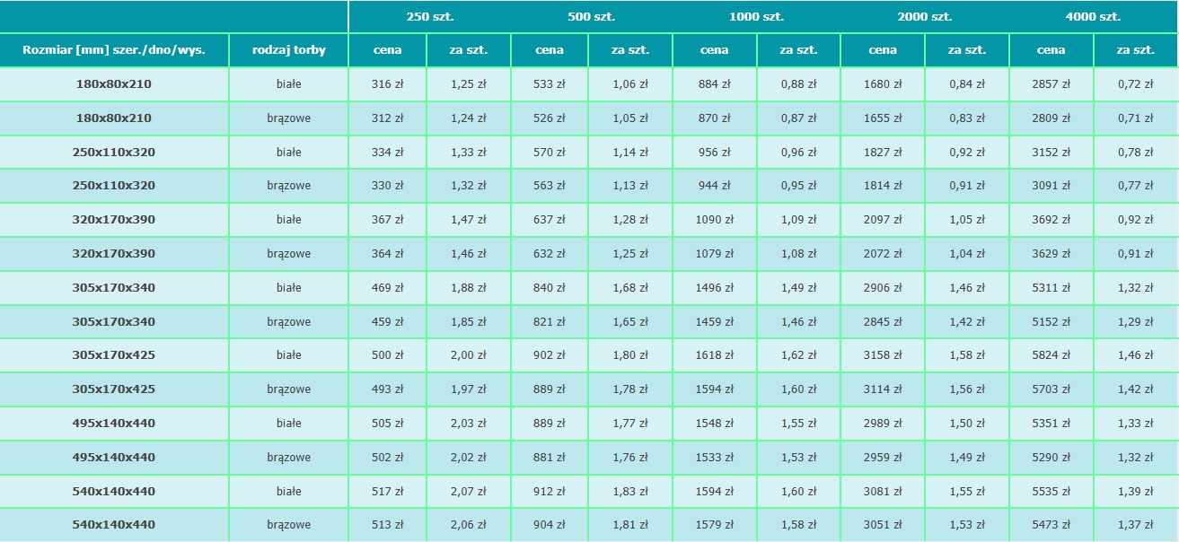 Cennik do 4000 sztuk jest na stronie. Cennik powyżej 4000 sztuk proszę pisać na maila: info@torbyzpapieru.pl .